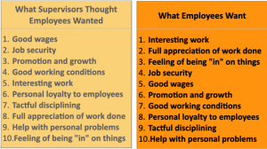 The 10 elements here are a mixture of extrinsic and intrinsic motivators. The results of Ken’s research are representative of many similar studies I have seen. For example, supervisors almost always list “good wages” as number one on their employees’ list; yet “good wages” are usually no better than number five on the employees’ list. I realise the preferences of your people may be different from this study. Therefore, read carefully Tip #4!