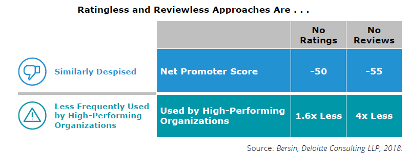 Even more, our research shows that ratingless and reviewless approaches are similarly despised. High-performing organisations (those that have the best business and workforce outcomes, and the most successful performance management approaches) are 1.6 times less likely to eliminate ratings and four times less likely to abolish reviews.