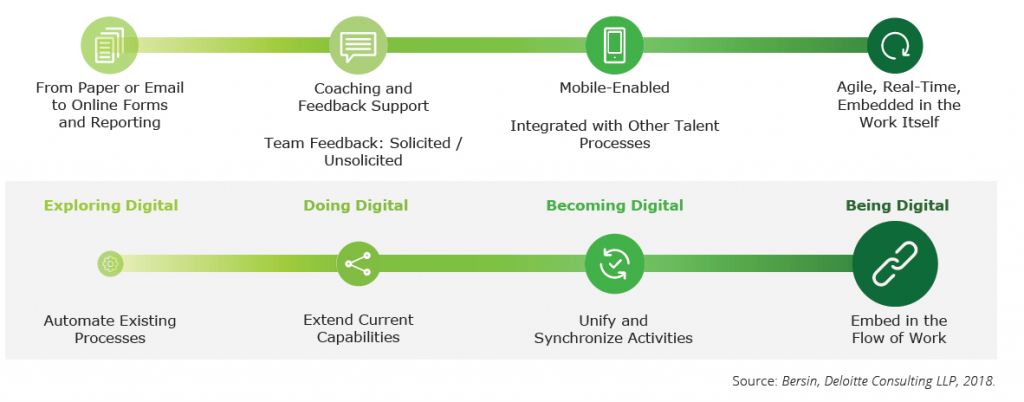 4. Technology: Use technology to embed performance and development in the flow of work. Once an organisation has shifted its thinking around its approach to performance management, a similar shift needs to occur in its approach to technology. High-performing organisations strategically use technology to enable the convergence of performance management and work. This bottom-up approach allows performance activities to occur in real-time, driven by individuals and teams as they work. This means using technology that serves up performance and development indicators in real-time to the people who do the work, and using technology that integrates seamlessly with work systems like email, calendar, project management, or sales support tools.